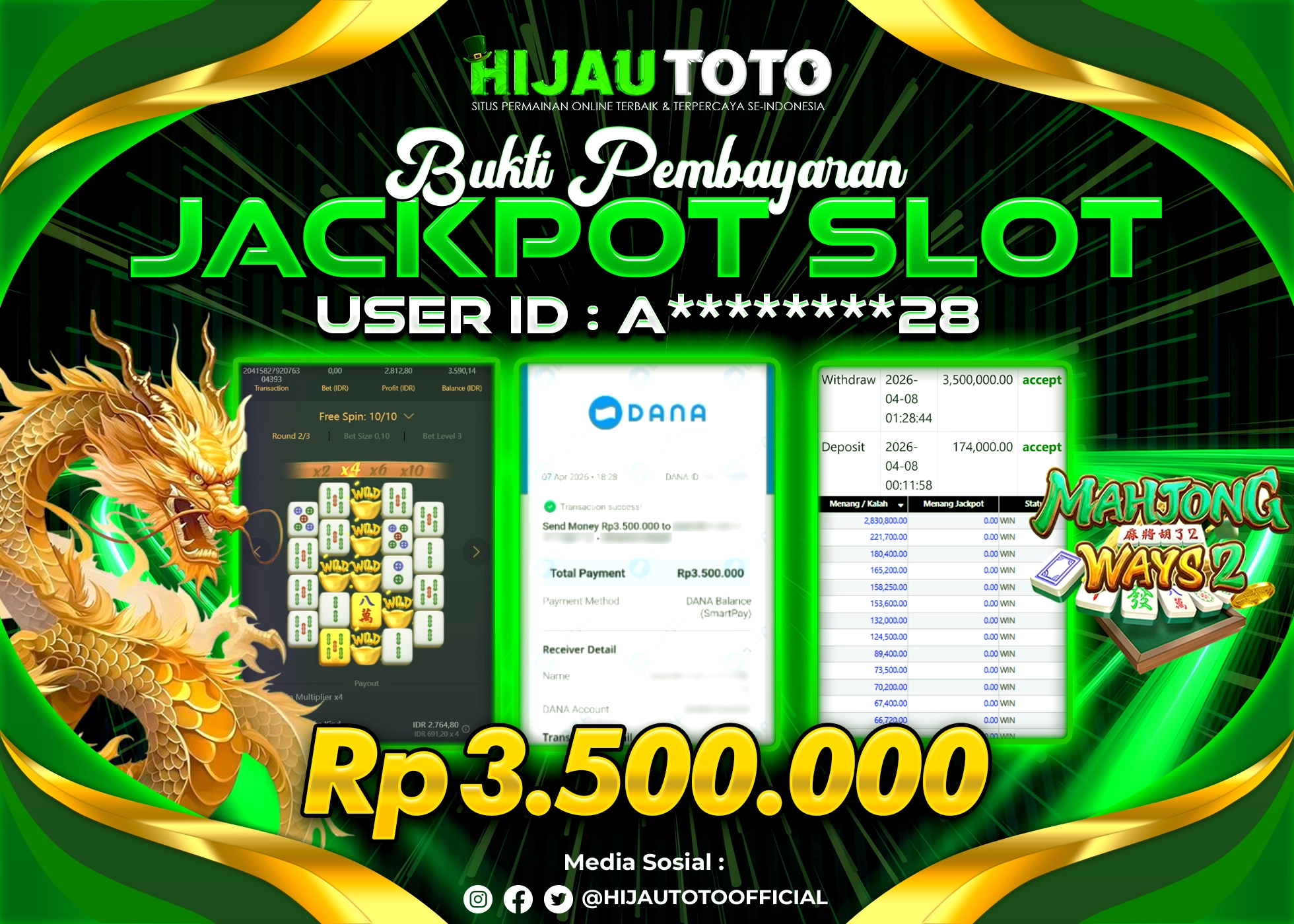 Selamat Kepada Member HIJAUTOTO A********28 Telah Jackpot Di SLOT MAHJONG WAYS 2