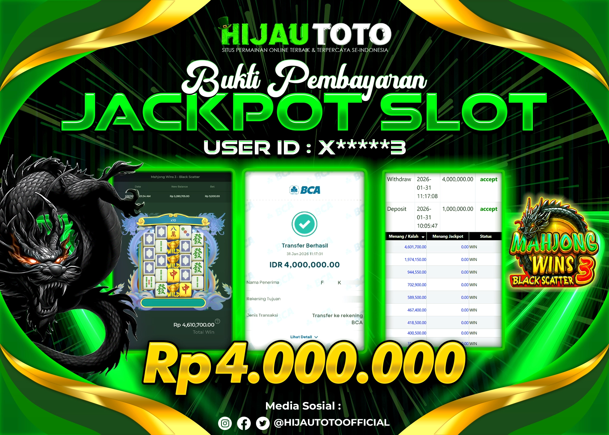 Selamat Kepada Member HIJAUTOTO X*****3 Telah Jackpot Di SLOT MAHJONG WINS 3 BLACK SCATTER