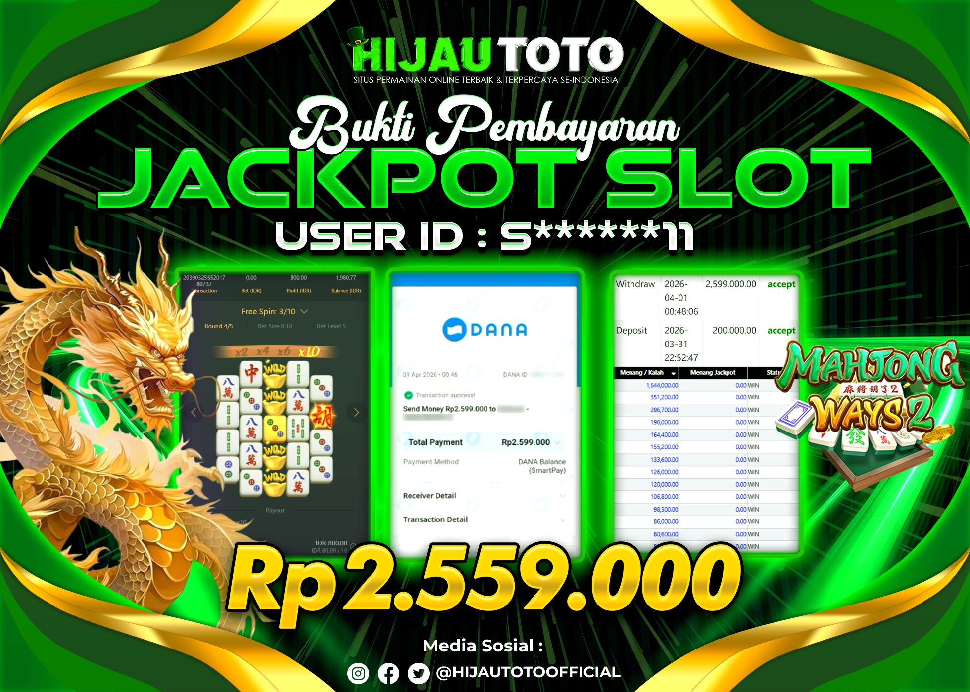Selamat Kepada Member HIJAUTOTO S******11 Telah Jackpot Di SLOT MAHJONG WAYS 2