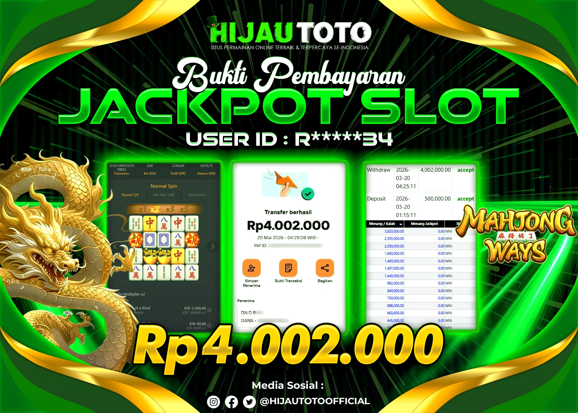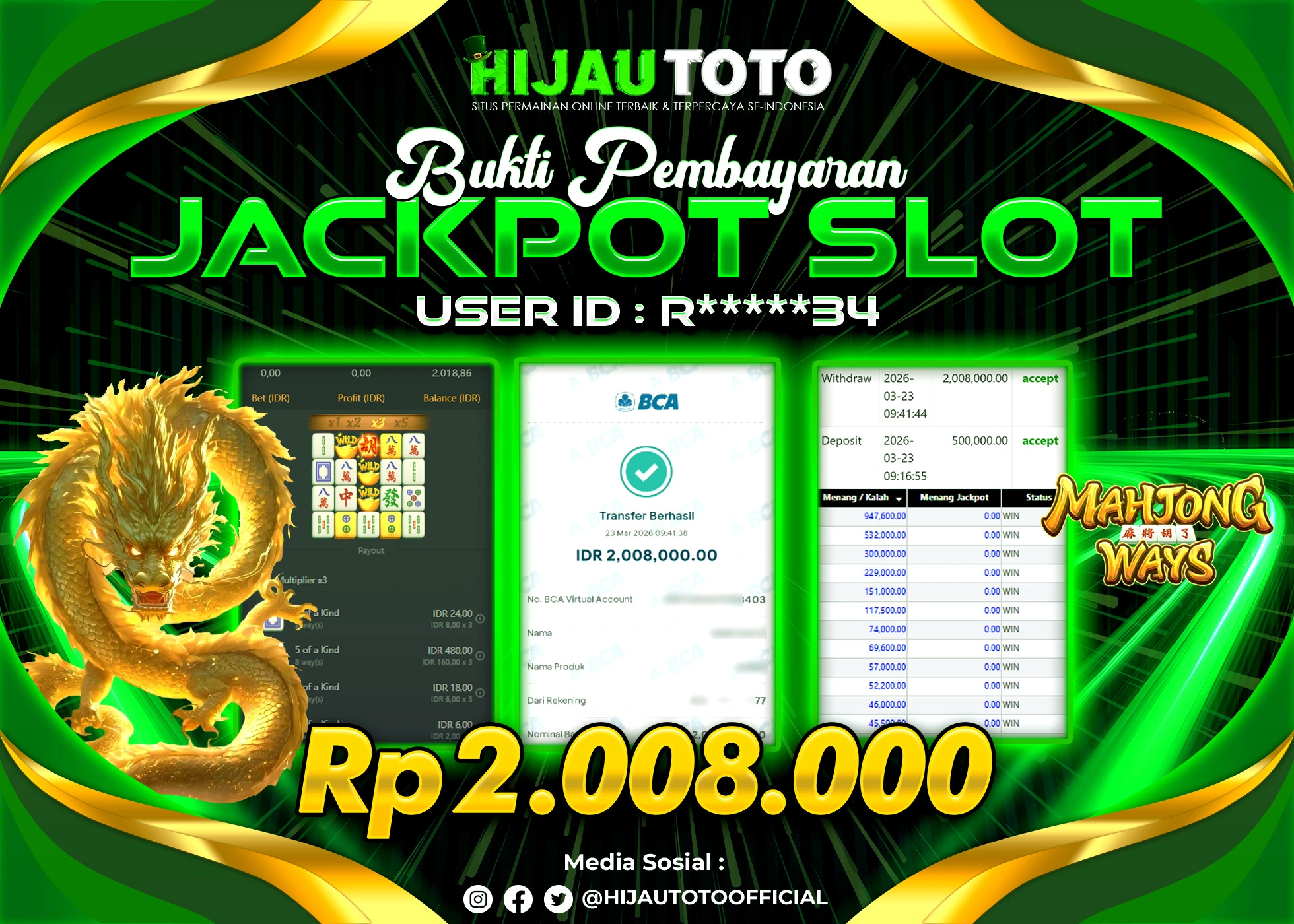Selamat Kepada Member HIJAUTOTO C****Y Telah Jackpot Di SLOT MAHJONG WAYS