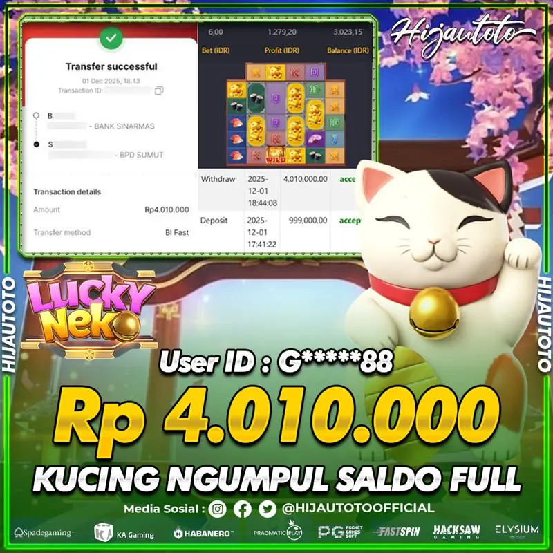 Selamat Kepada Member HIJAUTOTO G*****88 Telah Jackpot Di SLOT LUCKY NEKO