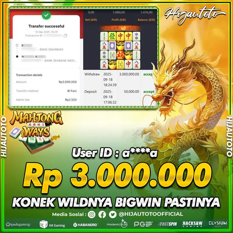 Selamat Kepada Member HIJAUTOTO A****A Telah Jackpot Di SLOT MAHJONG WAYS