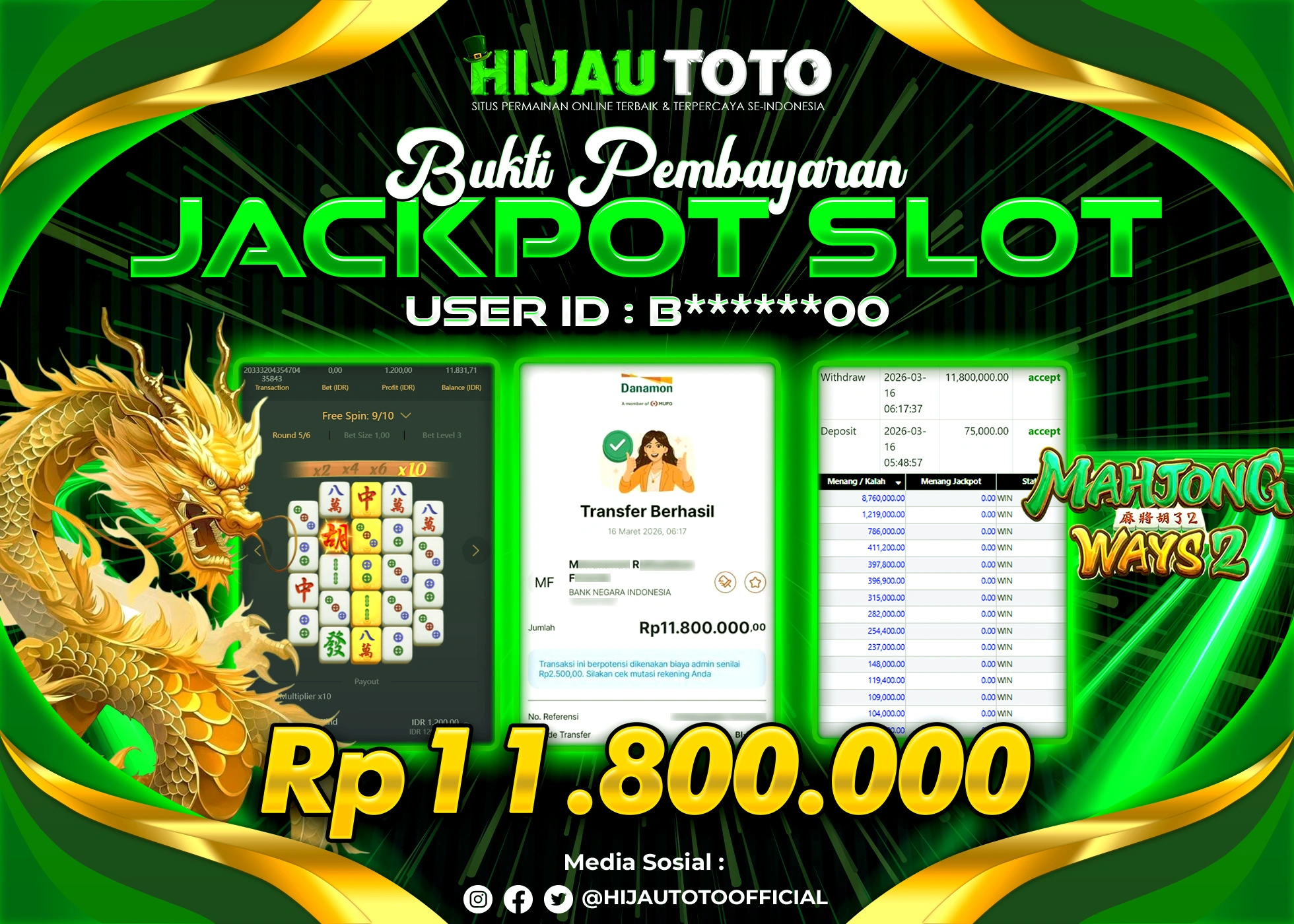 Selamat Kepada Member HIJAUTOTO B******00 Telah Jackpot Di SLOT MAHJONG WAYS 2