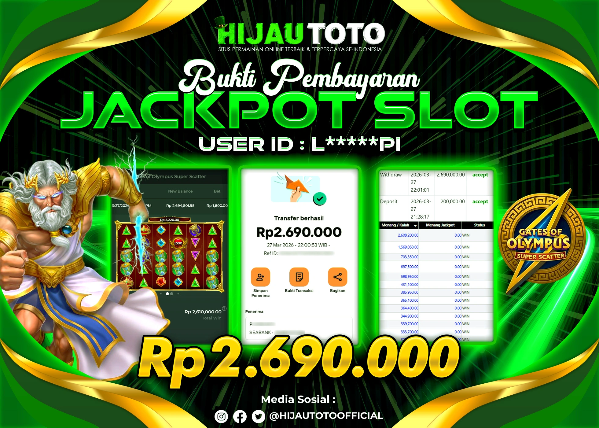 Selamat Kepada Member HIJAUTOTO P***H*****5 Telah Jackpot Di SLOT GATES OF OLYMPUS 1000