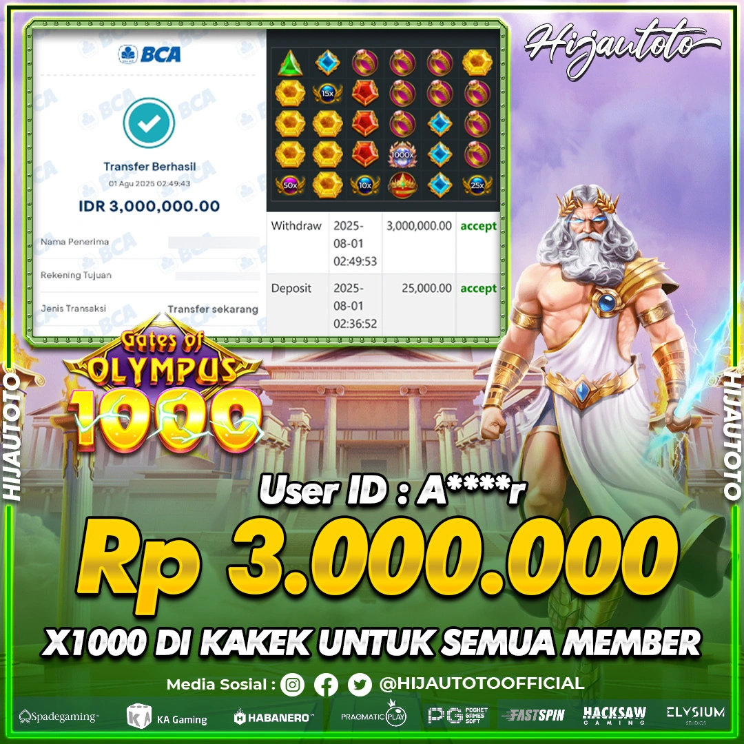 Selamat Kepada Member HIJAUTOTO A****R Telah Jackpot Di SLOT GATES OF OLYMPUS 1000