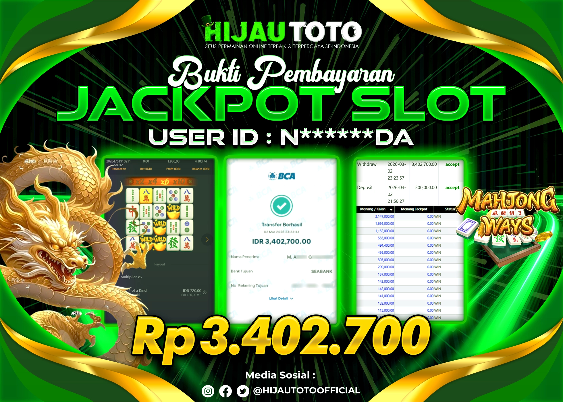 Selamat datang di HIJAUTOTO, tempatnya seru-seruan dan cuan besar! Mulai main cukup dengan modal Rp5.000 aja, taruhan super murah dari Rp100 perak! Mau main slot yang penuh warna? Atau togel dari 20 pasaran paling hits? Atau mungkin tembak ikan yang bikin deg-degan? Tenang, ada juga taruhan bola, sabung ayam, dan live casino yang bikin suasana makin hidup! Daftar sekarang dan dapetin bonus new member 100% langsung, biar modalmu makin tebal. Deposit gampang banget, bisa pakai QRIS, dan kalau butuh bantuan, customer service kita siap 24 jam nonstop. Jadi, tunggu apa lagi? Yuk, gabung dan bawa pulang kemenangannya cuma di HIJAUTOTO!